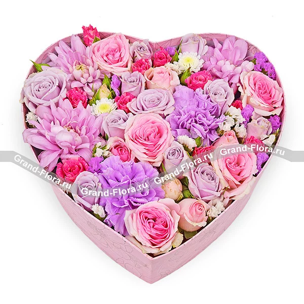 Стандартный: гвоздика фиолетовая - 2 шт., хризантема кустовая ромашковая фиолетовая - 1 шт., роза кустовая розовая - 1 шт., роза кустовая фиолетовая - 1 шт., роза кустовая розово-белая - 1 шт., хризантема сантини - 1 шт., статица, оазис, коробка.