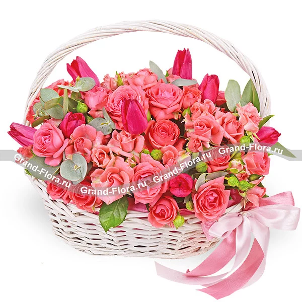 Стандартный: тюльпаны розовые - 5 шт., роза кустовая розовая 4 шт., роза розовая - 4 шт., эвкалипт, оазис, корзина, лента.