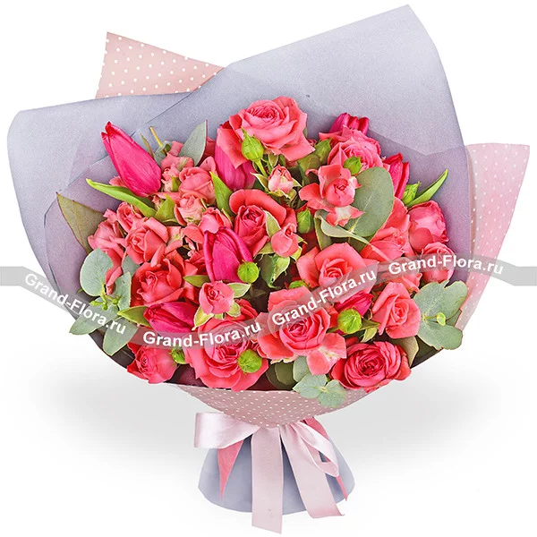 Стандартный: тюльпаны розовые - 7 шт., роза кустовая розовая - 10 шт., эвкалипт., упаковка, лента.