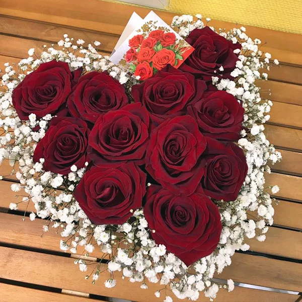 11 роз (на фото): роза красная - 11 шт., гипсофила, оазис сердце малое. Примерный размер: 25Х25 см.