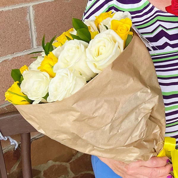 Букет выполнен из ярких желтых роз, и белых роз Ломоносов, с акцентами питтоспорума в стильном крафте и лентой нежного оттенка. Букет имеет высоту от 35 см, а диаметр букета зависит от выбранного Вами количества цветов. Обращаем Ваше внимание, что состав и оформление букета могут отличаться.
