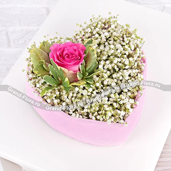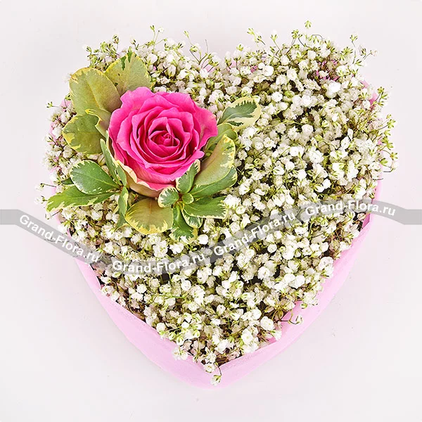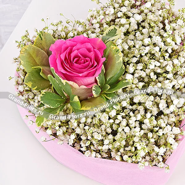 Уменьшенный: роза розовая - 1 шт., гипсофила - 7 шт., питтоспорум, фетр, оазис.
