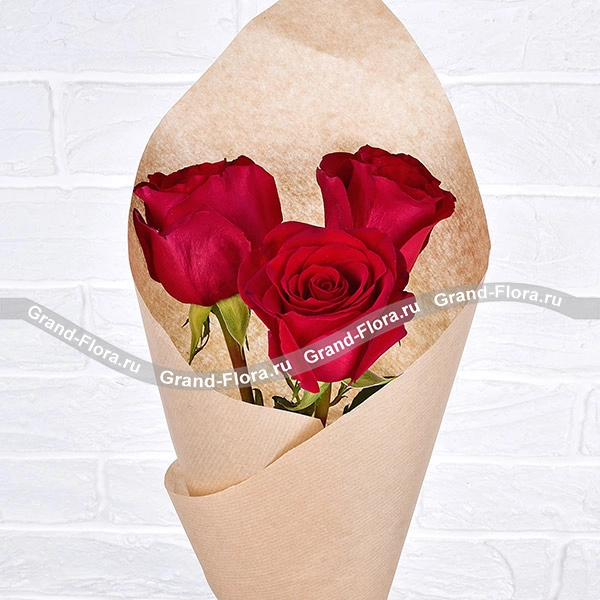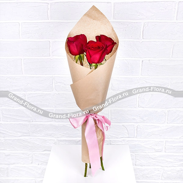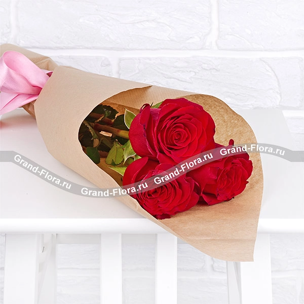 Стандартный: роза красная - 3 шт., упаковка крафт, лента.