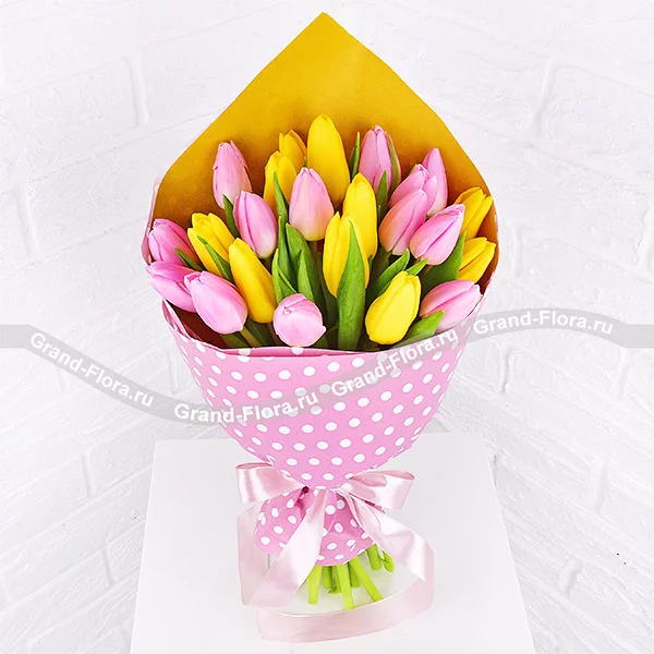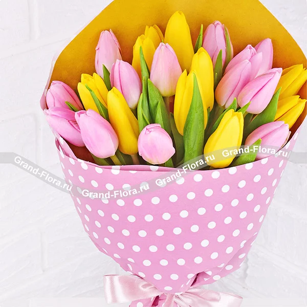 Нежное счастье - букет из желтых и розовых тюльпанов