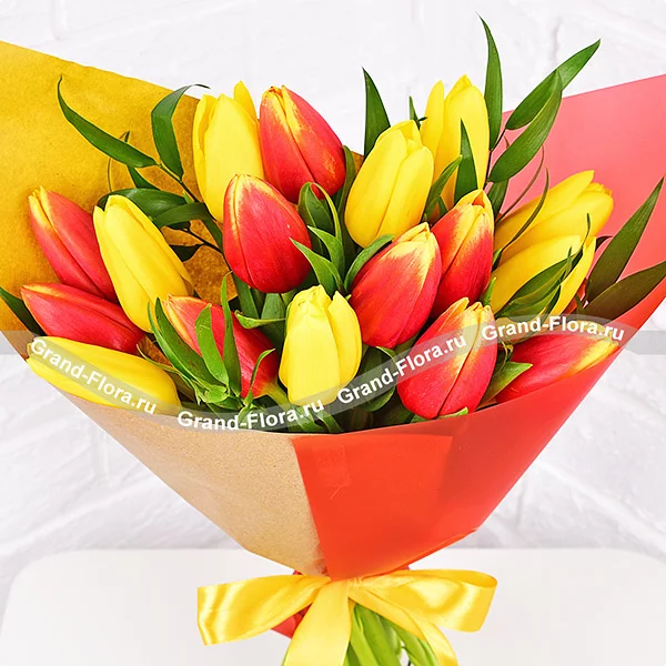 Букет выполнен из чудесных желтых тюльпанов и красочных красных тюльпанов, с яркими желтыми лепестками. Композиция окунает нас в воспоминания о прекрасных мгновениях жизни и наполняет сердце любовью и теплом. Высота букета от 30 см,а диаметр зависит от выбранного Вами количества цветов: Вы можете выбрать небольшой уютный букет, а можете преподнести своим близким целую охапку красочных тюльпанов. Обращаем Ваше внимание, что состав и оформление могут отличаться.