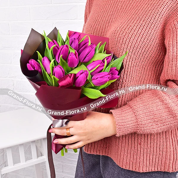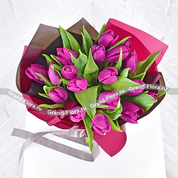 19 тюльпанов: тюльпаны фиолетовые - 19 шт., упаковка , лента.