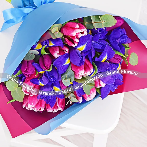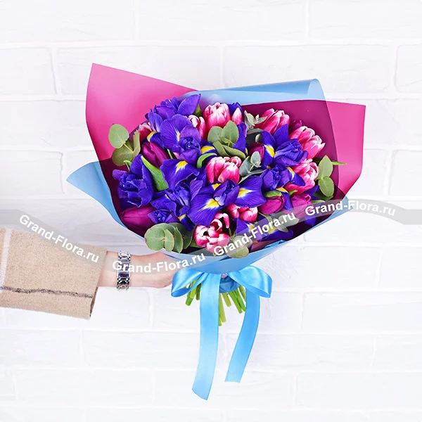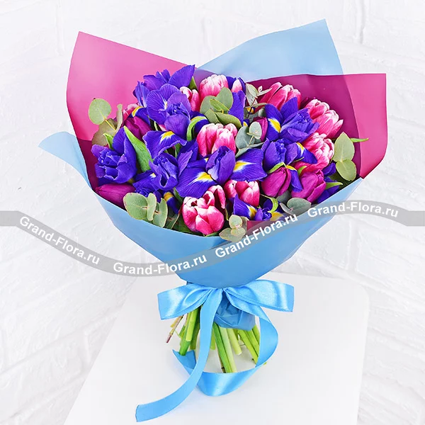 Уменьшенный: тюльпан розовый - 3 шт., тюльпан фиолетовый - 2 шт., ирис синий - 4 шт., упаковка, лента.
