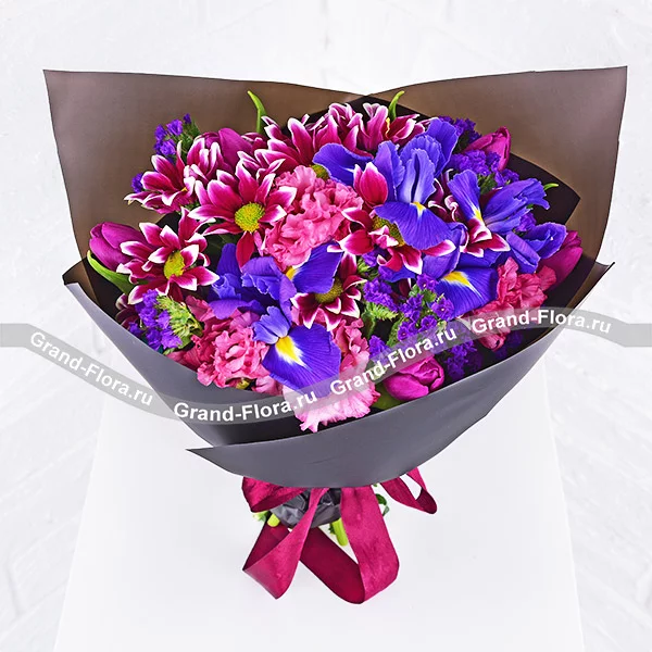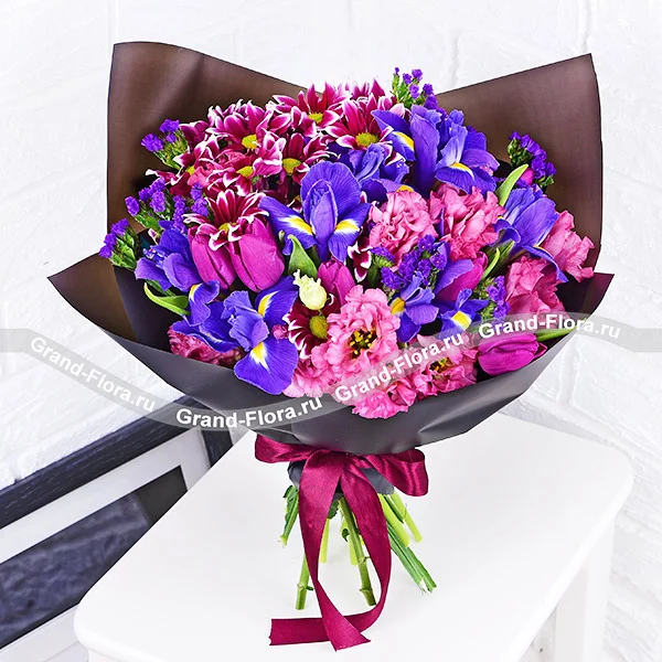 Люкс: ирисы - 8 шт., хризантема кустовая фиолетовая - 3 шт., эустома розовая - 9 шт., тюльпан фиолетовый - 7 шт., статица, упаковка, лента. Примерный размер: 45Х45 см.
