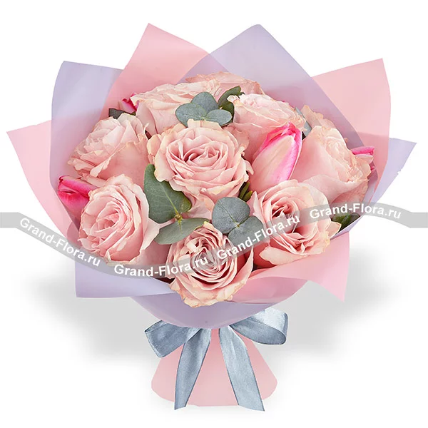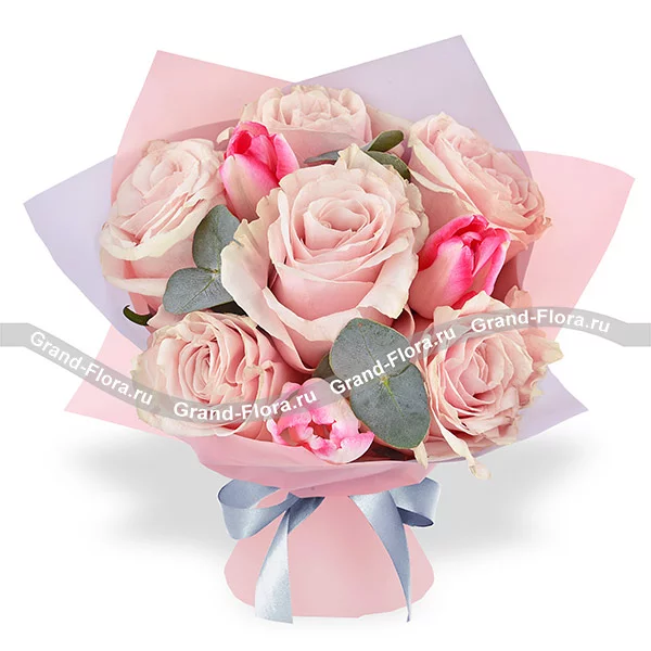 Счастливая весна - букет с розовыми розами и тюльпанами