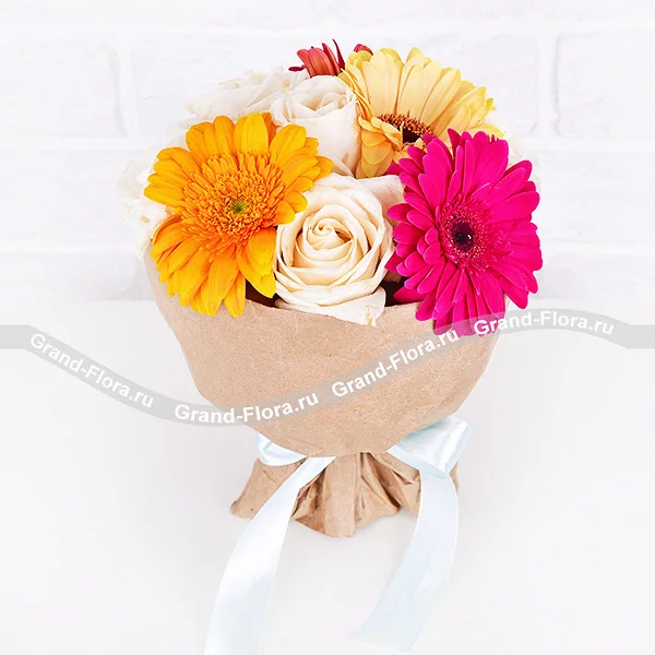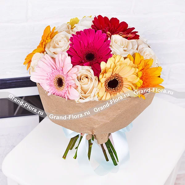 Пышная композиция, собравшая в себе милые герберы и очаровательные розы. На полотне букета, буйством красок собраны цвета, воплощающие и нежность, и игривость и романтику каждого дня.