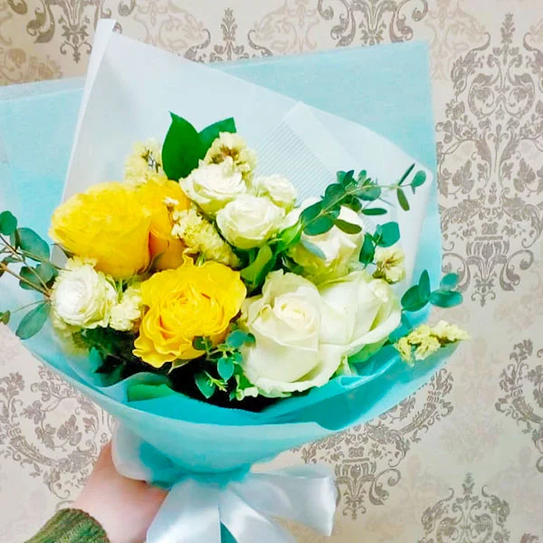 Стандартный: роза белая - 4 шт., роза желтая - 4 шт., роза кустовая желтая - 1 шт., роза кустовая белая - 2 шт., декоративная зелень, упаковка, лента. *Возможна замена кустовой розы на один оттенок (только белые или только желтые),декоративная зелень может отличаться от фото.