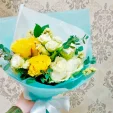 Уменьшенный: роза белая - 3 шт., роза желтая - 3 шт., роза кустовая желтая - 1 шт., декоративная зелень, упаковка, лента. *Возможна замена кустовой розы на один оттенок (только белые или только желтые),декоративная зелень может отличаться от фото.