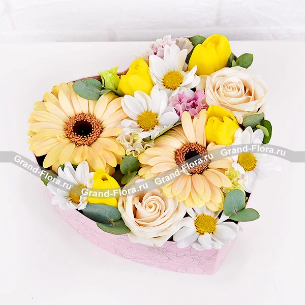 Стандартный: тюльпан желтый - 4 шт., роза белая - 2 шт., гербера желтая - 2 шт., хризантема кустовая белая - 1 шт., эустома розовая - 1 шт., эвкалипт, оазис, коробка.