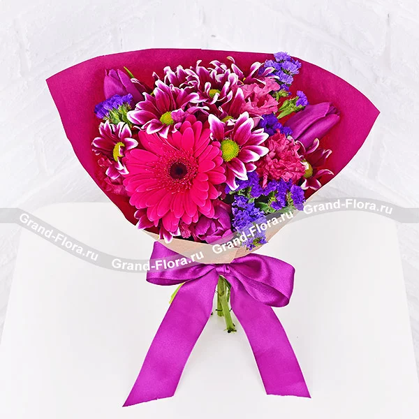 Стандартный: гербера малиновая - 3 шт., тюльпан фиолетовый - 4 шт., хризантема кустовая фиолетовая - 3 шт., эустома розовая - 3 шт., статица., упаковка, лента. Примерный размер: 35Х35 см.