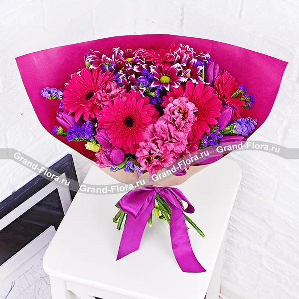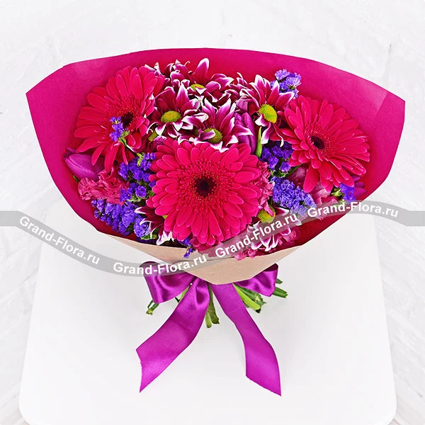 Люкс: гербера малиновая - 5 шт., тюльпан фиолетовый - 10 шт., хризантема кустовая фиолетовая - 4 шт., эустома розовая - 4 шт., статица., упаковка, лента. Примерный размер: 40Х40 см.