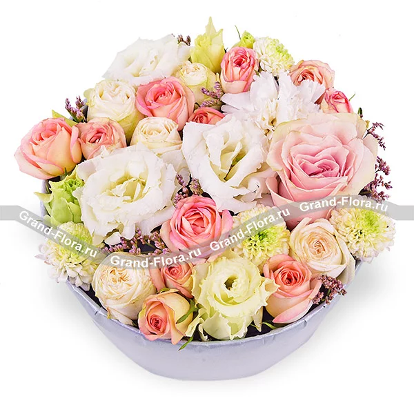 Стандартный: эустома белая - 1 шт., роза розовая - 1 шт., роза кустовая розовая - 3 шт., хризантема кустовая белая - 2 шт., лимониум, оазис, коробка. Примерный размер: 25Х25 см.