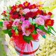 Стандартный: роза красная - 4 шт., роза кустовая розовая - 3 шт., эустома розовая - 2 шт.,гиперикум красный - 1 шт., декоративная зелень., оазис, коробка.