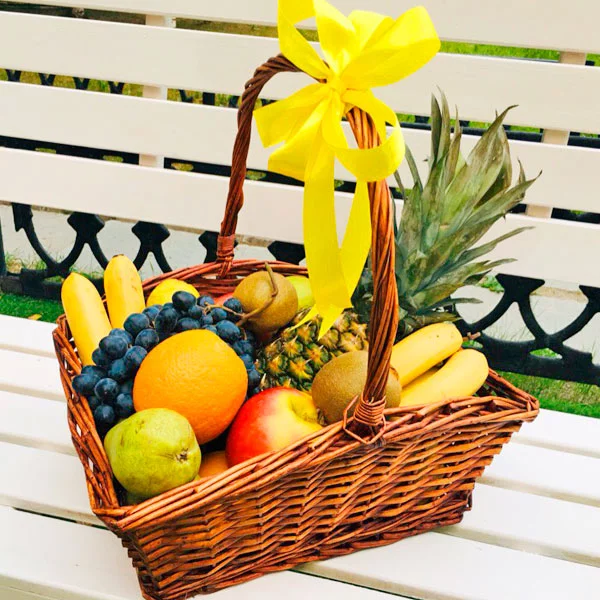 Стандартный (на фото): ананас - 1 шт., яблоки - 0,7 кг., виноград - 0,7 кг, апельсины - 1 кг., лимон - 2 шт., киви - 3 шт., груши - 0,5 кг., слива - 3 шт., бананы - 0,7 кг., корзина.