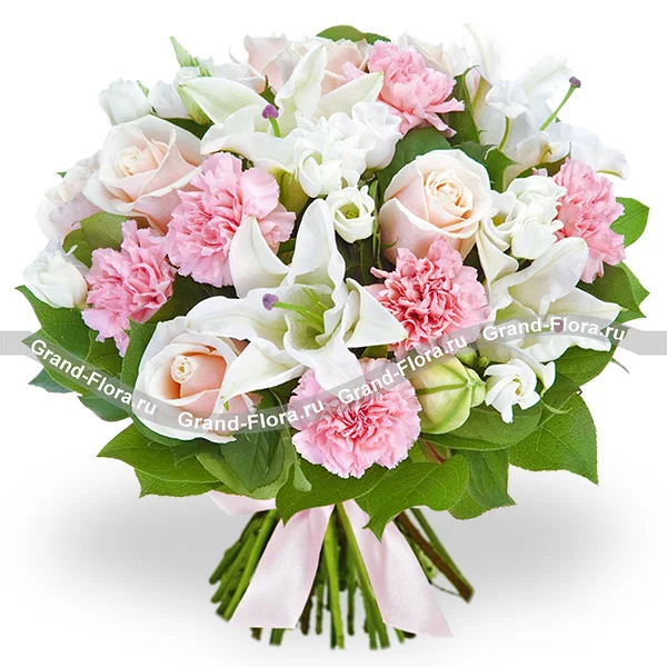 Полный непередаваемой нежности букет, способен пробудить вдохновение и вселить веру в прекрасное будущее. Подарите своему любимому человеку букет, который останется в его сердце на долгое время. Тонкое сочетание белых лилий и нежно – розовых гвоздик и роз, аккуратно дополненных эустомой, создают неповторимую композицию, которая вне всяких сомнений очарует и подарит счастливую улыбку Вашему близкому человеку.