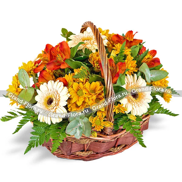 Стандартный (на фото): альстромерия оранжевая - 3 шт., хризантема кустовая желтая - 4 шт., гербера белая - 4 шт., эвкалипт, папоротник, оазис, корзина.
