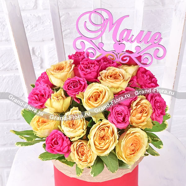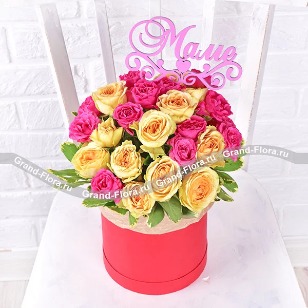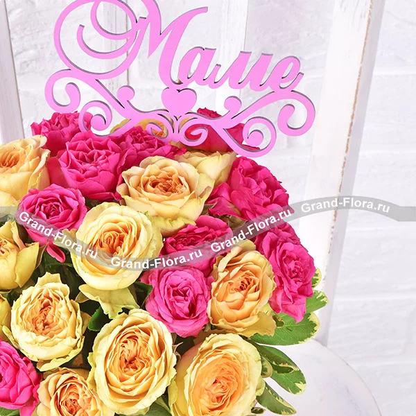 Стандартный: роза кустовая желтая (кремовая) - 6 шт., роза кустовая розовая - 5 шт., декоративная зелень, оазис, топпер "Маме", коробка.