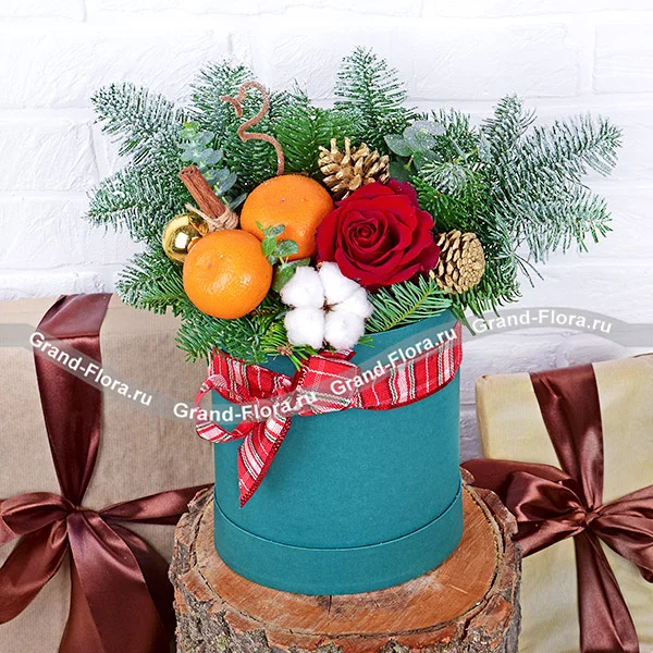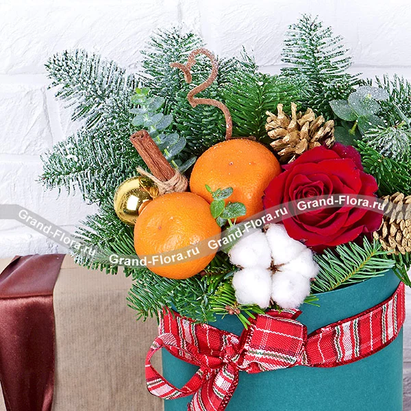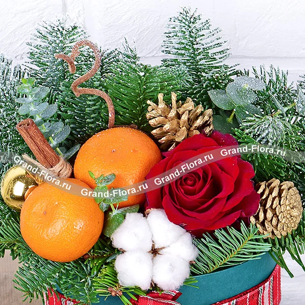 Стандартный: роза красная - 1 шт., мандарины - 2 шт., эвкалипт - 1 шт., хлопок - 1 шт., шишки - 2 шт., корица, шарик, ель, оазис, коробка.