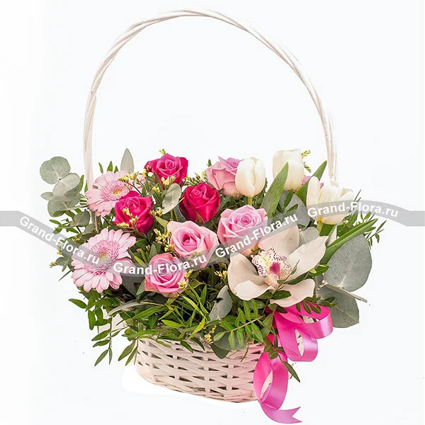 роза розовая - 5 шт., роза фуксия - 3 шт., гербера розовая - 3 шт., тюльпан белый - 3 шт., орхидея белая - 1 шт., декоративная зелень, оазис, лента, корзина средняя.