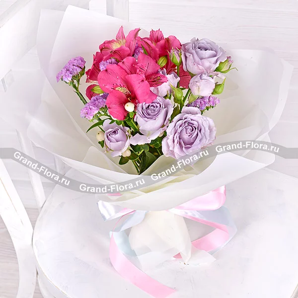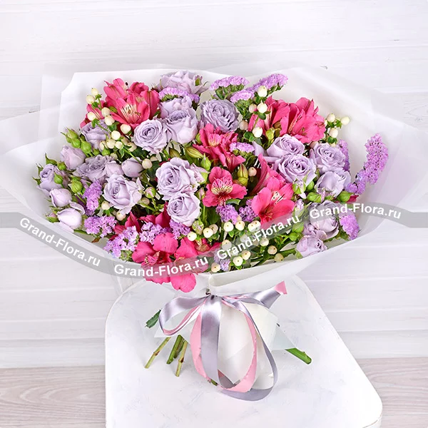Роза кустовая светло-сиреневая (возможна замена на розовую) - 2 шт., альстромерия розовая/фиолетовая– 2 шт., гиперикум белый – 1 шт., статица светло-фиолетовая (сиреневая) – 1 шт., упаковка, лента.