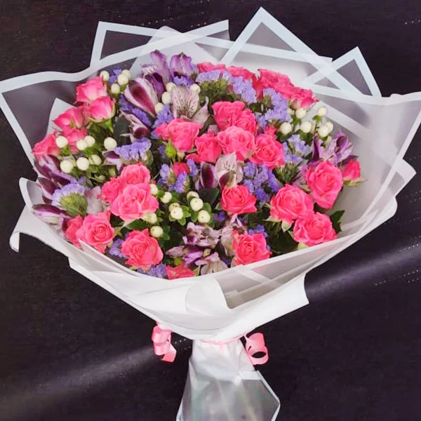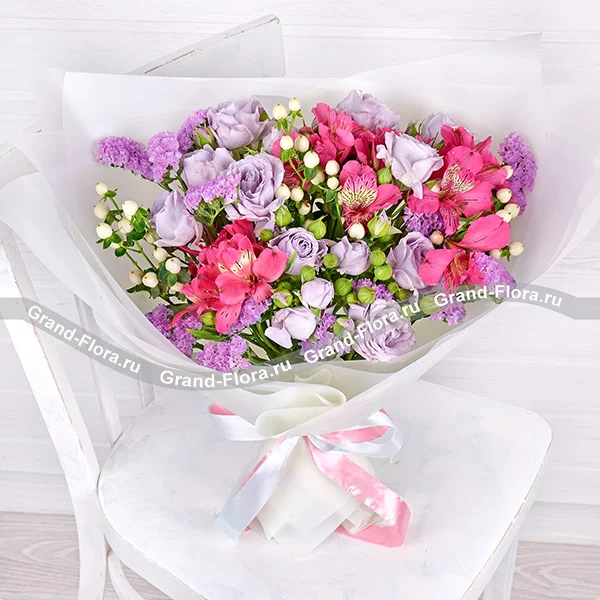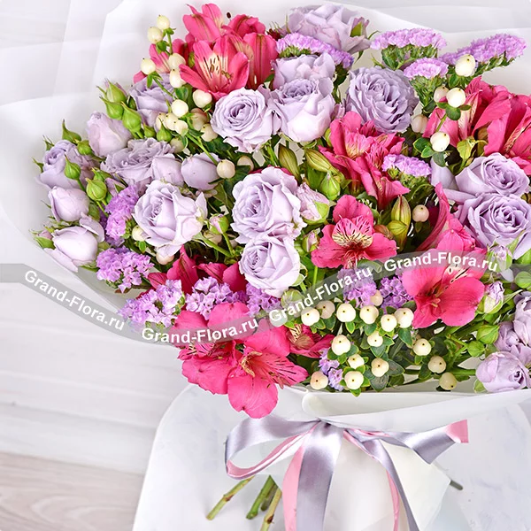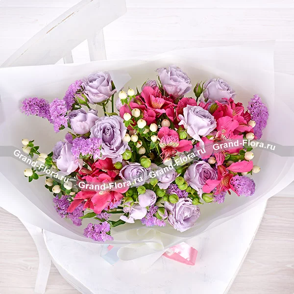 Роза кустовая светло-сиреневая (возможна замена на розовую)- 5 шт., альстромерия розовая/фиолетовая – 5шт., гиперикум белый – 5шт., статица светло-фиолетовая – 3шт., упаковка, лента.