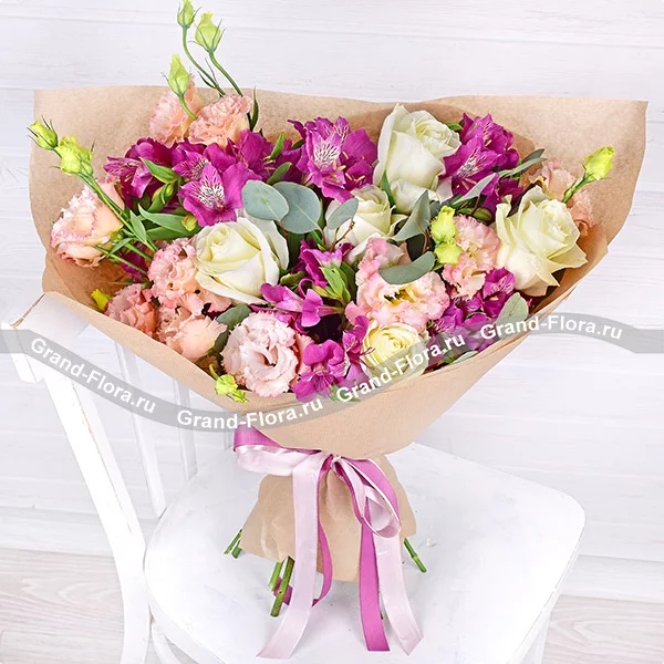 Букет "Самой чудесной" - новинка, состоящий из роз, фиолетовых альстромерий и розовой эустомы. Розы являются символом любви и романтики, а фиолетовые альстромерии и розовая эустома добавляют нотку эксклюзивности и роскоши в букет.