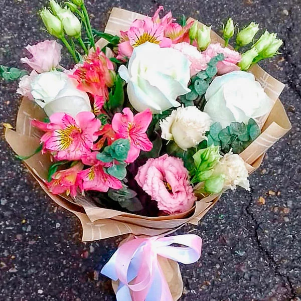 Роза белая- 5 шт., эустома розовая –  5 шт., альстромерия фиолетовая/розовая – 5 шт., декоративная зелень (эвкалипт) –  3 шт., упаковка, лента.
