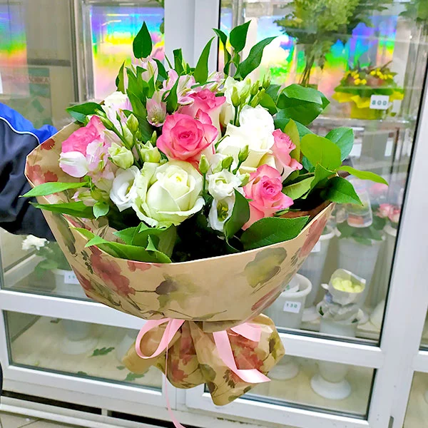 Роза белая- 3шт., эустома розовая –  3шт., альстромерия фиолетовая/розовая –3шт., декоративная зелень (эвкалипт) – 2шт., упаковка,лента.