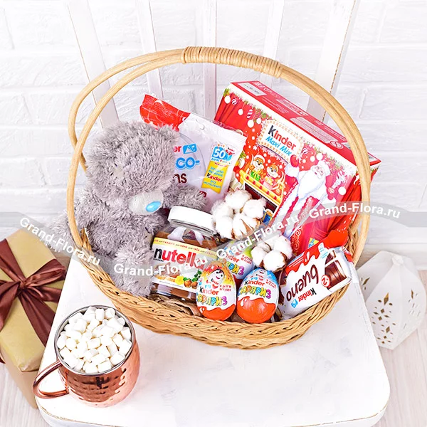 Состав: Мишка плюшевый - до 20см. - 1 шт., Шоколадная паста Nutella 180гр. - 1шт., Kinder шоколадное яйцо - 3 шт., Kinder Bueno - 1шт., Kinder Maxi Mix 223гр - 1 шт., Kinder Choco-Bons 125 гр - 1 шт., Хлопок - 2 шт., корзина средняя.