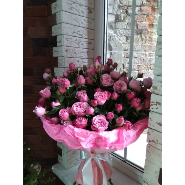 Стандартный: роза кустовая розовая - 9 шт, упаковка, лента розовая. Примерный размер: 25Х25 см.
