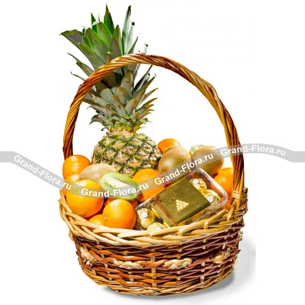 Ананас - 1шт (1кг), апельсины - 2 кг, киви - 6 шт., конфеты Ferrero - 1 шт.