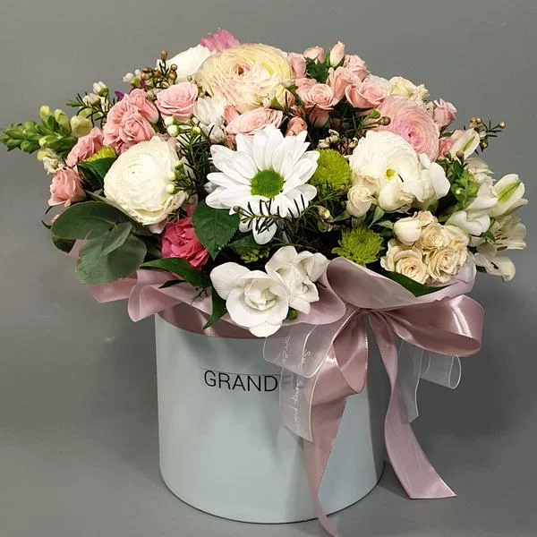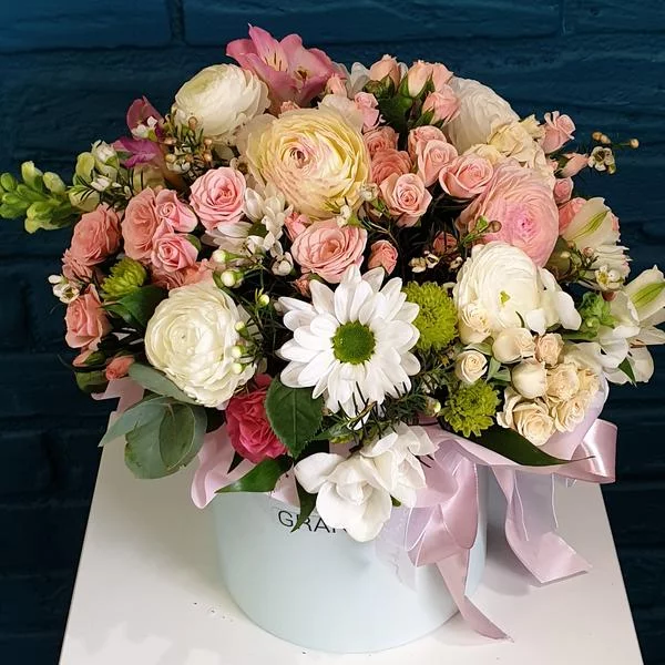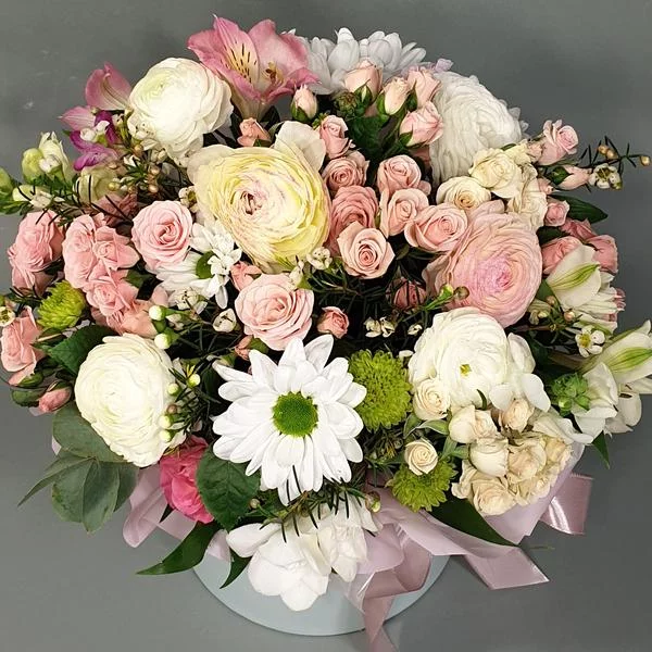 Стандартный: роза розовая - 3 шт., роза белая - 3 шт., кустовая роза розовая - 4 шт., кустовая роза белая - 3 шт., хризантема кустовая ромашковая белая - 1 шт., альстромерия белая - 2 шт., альстромерия розовая - 1 шт., декоративная зелень (хамелациум,львиный зев/возможна замена), оазис, коробка.