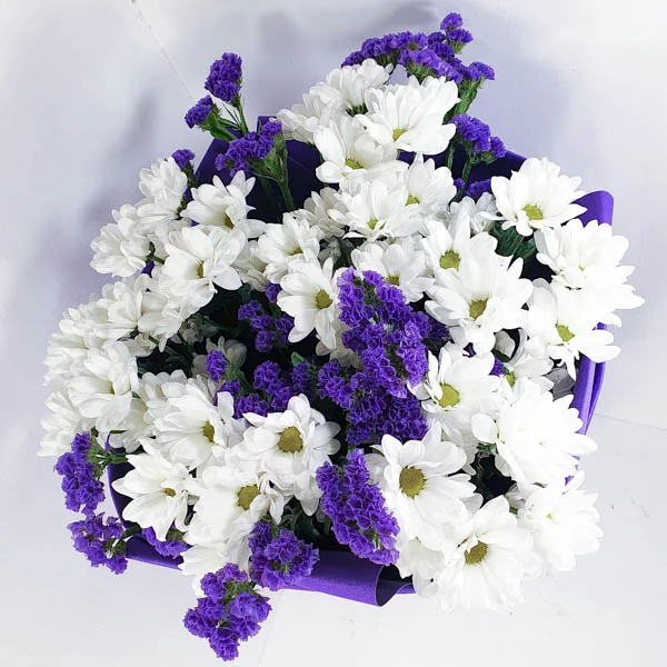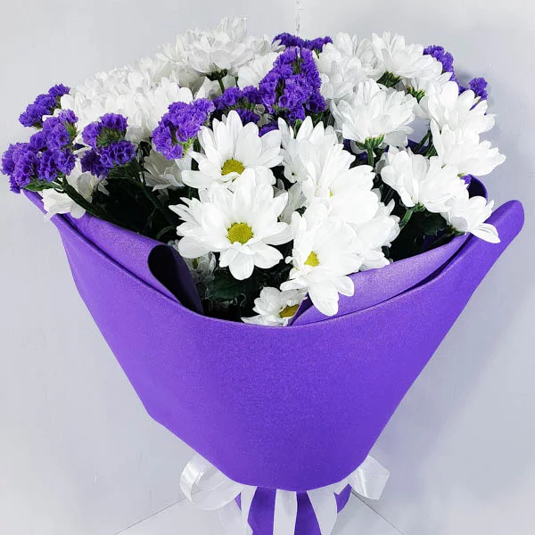 хризантема белая кустовая ромашковая - 7 ., статица - 3 шт., салал, фетр фиолетовый. Примерный размер: 25Х30 см. Данный букет представлен на фото