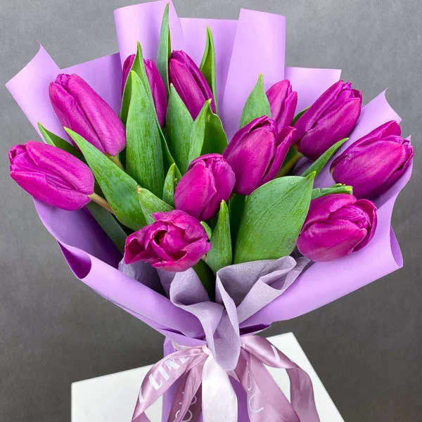 Тюльпан – это нежный и хрупкий цветок, который способен покорить своей красотой даже самое неприступное и ледяное сердце. А огромный букет фиолетовых тюльпанов может стать для вас началом примирения с любимой девушкой или зажжет страсть в глазах сотрудницы, которая вам давно симпатична.