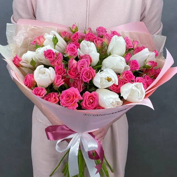 Очень нежная композиция из розово-кустовых роз и белых тюльпанов - это лучший способ рассказать о своей любви без помощи слов. Так же преподнести данный букет можно без повода или в качестве извинения. Цветочное творение будет радовать Вас не меньше 5 дней*.
