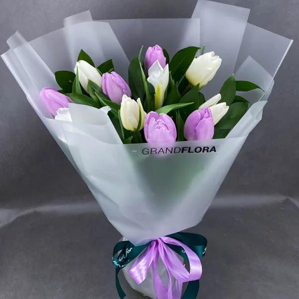 11 тюльпанов: тюльпаны белые и сиреневые/розовые - 11 шт., упаковка , лента.