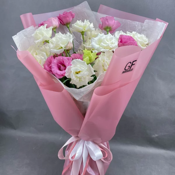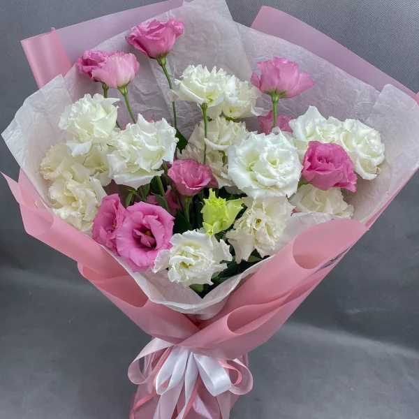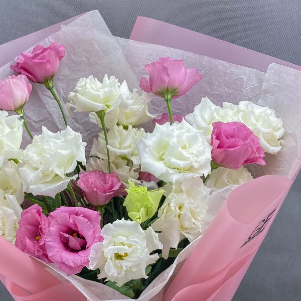 Стандартный: эустома розовая - 7 шт., эустома белая - 4 шт., декоративная зелень, упаковка крафт, лента розовая.