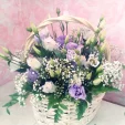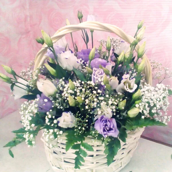 Нежное сочетание белых и сиреневых эустом выигрышно подчеркивает гипсофила и декоративная зелень. Букет, помещенный в изящную корзину, станет безупречным решением для вручения дорогому человеку на праздник.